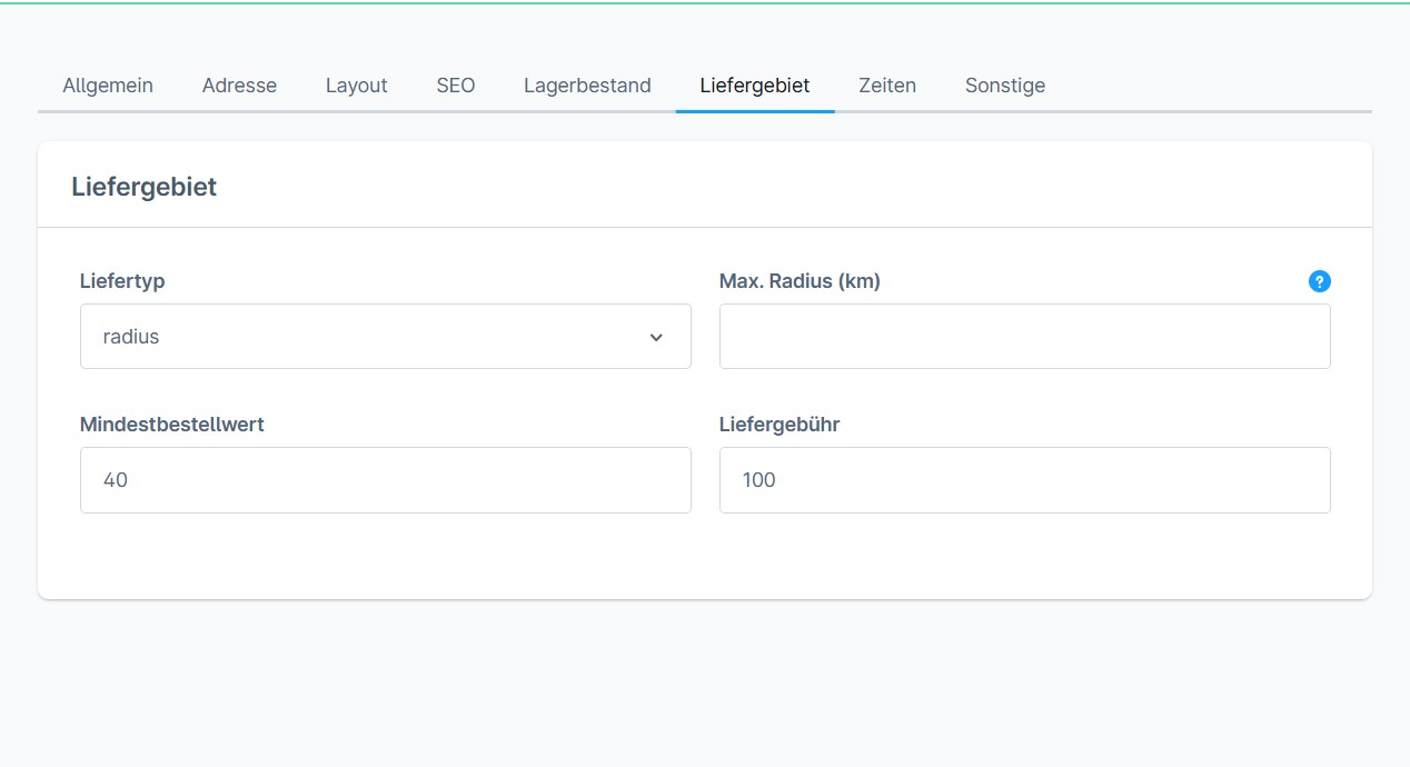 Es kann je Standort ein Liefergebiet definiert werden. Dieses beinhaltet den Lieferradius, den Mindestbestellwert und die jeweilige Liefergebühr.