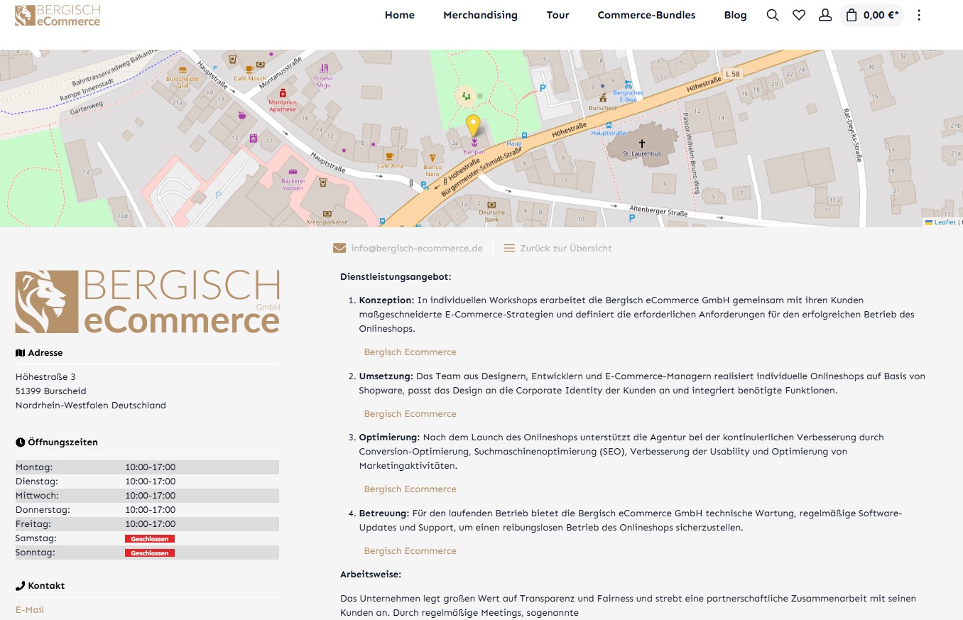 Mit der Händlersuche können individuelle Händlerprofile erstellt werden. Das Plugin ermöglicht es Händler, Verkaufsfilialen und weitere Standorte einfach in einer Erlebniswelt darzustellen. Es besteht die Möglichkeit, zusätzlich eine eigene CMS Seite anzuzeigen.